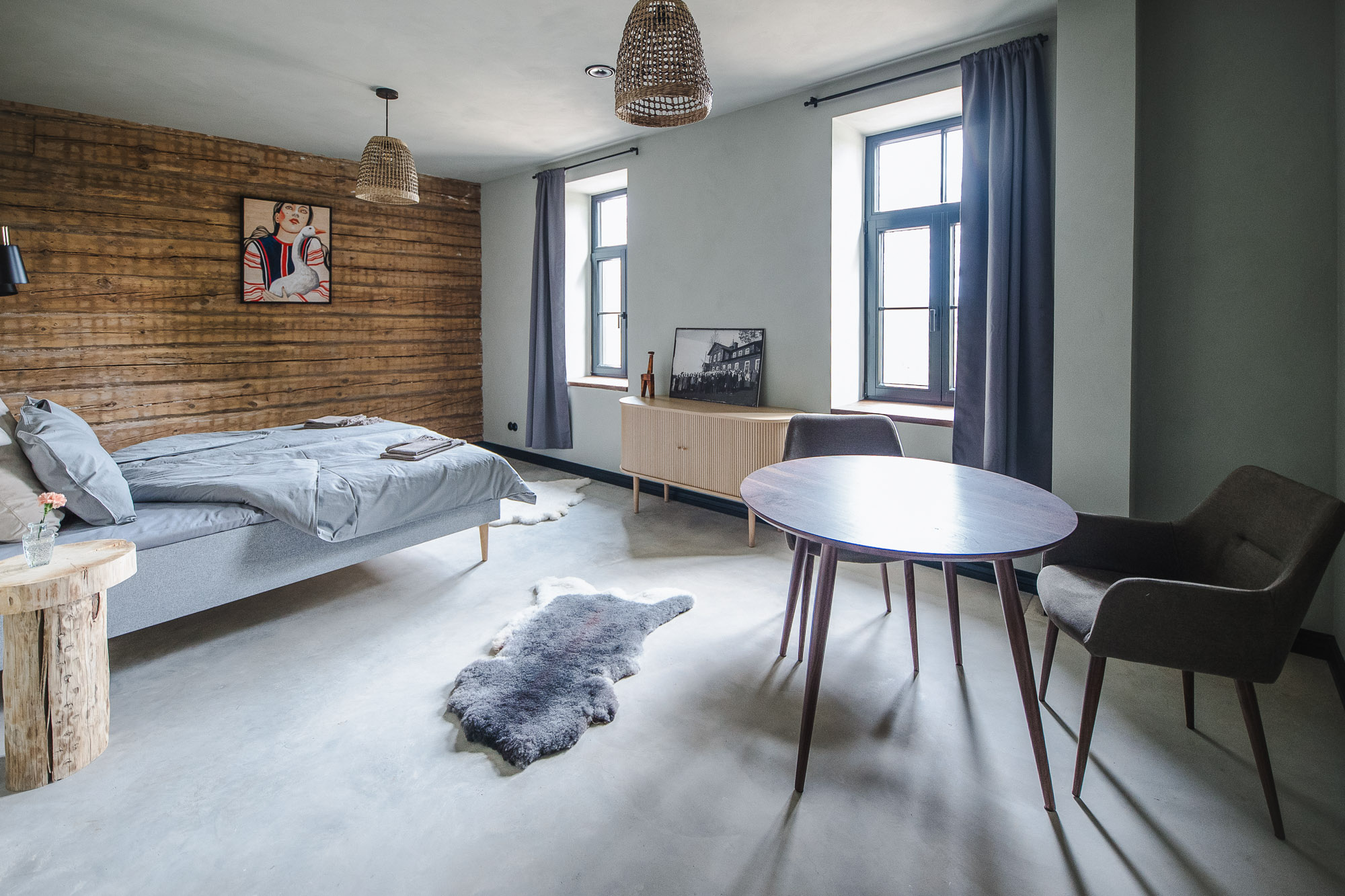 Irboska is a 2-room unit located on the first floor of Ilmaveere. It has an exceptional view of Obinitsa Lake. Saviukumaja velvety matte paints and slightly textured natural clay are used to give the room a mild green palette. This is accompanied by the restored old logs. Dark clay marmorino in the bathroom adds a luxurious finish. The larger room accommodates two, and the smaller one has a single bed.