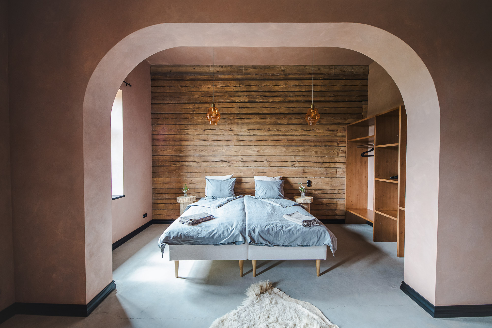 Raakva is a spacious two-bedroom, three-person Junior Suite on the second floor in Ilmaveere. It has a spectacular view of the terrace and Obinitsa Lake. Being slightly pink, it has a certain romantic feel to it. The coloring is done by the clay paints of Saviukumaja. By mixing these with earthly tones, we got just the right palette – the early spring and lilacs blossoming. An arch in the ceiling, found only in this room, adds to the romance.
